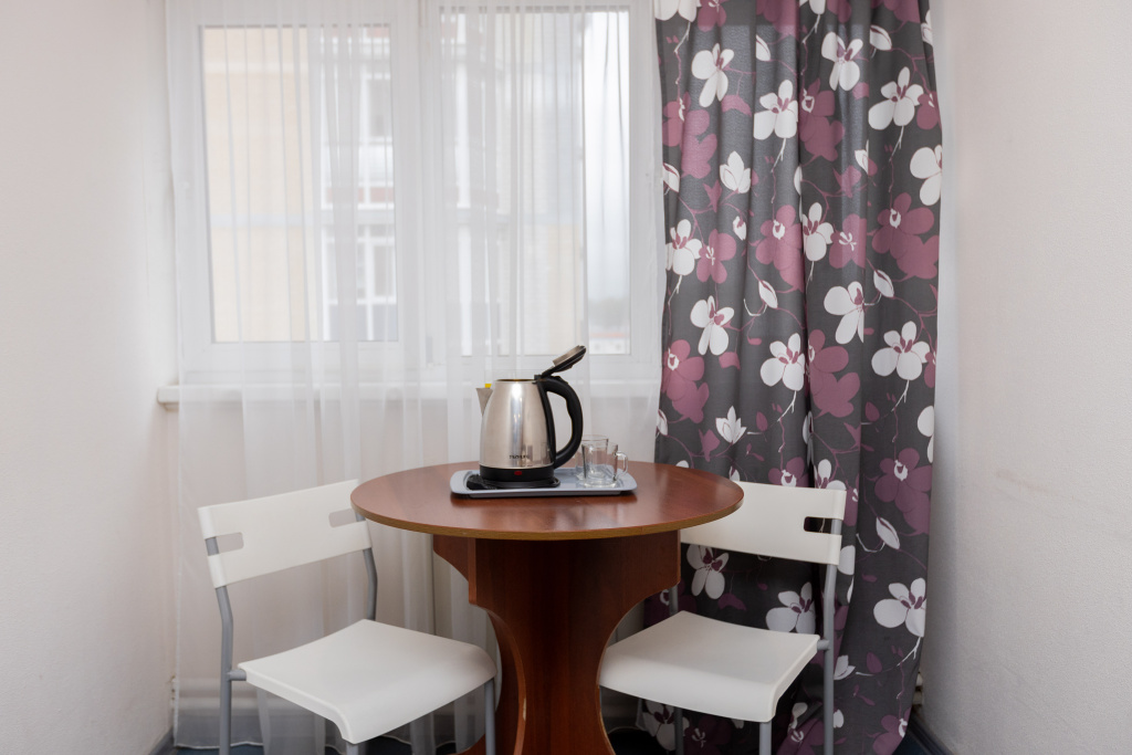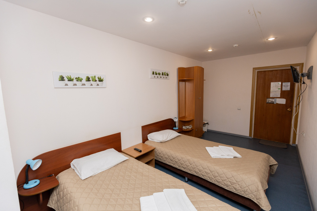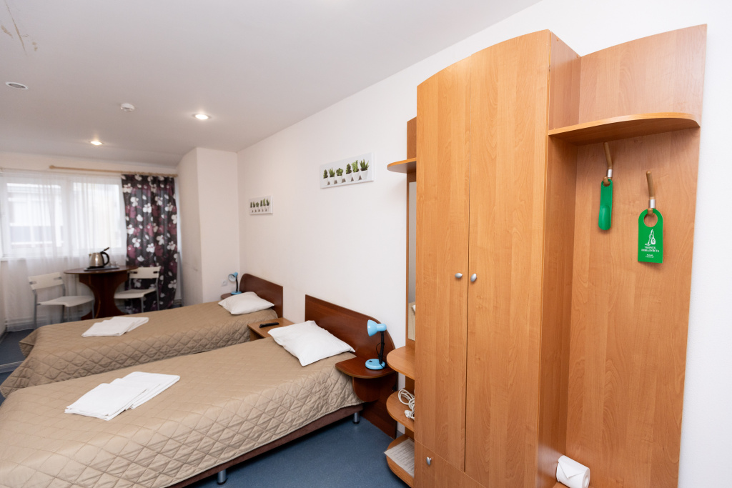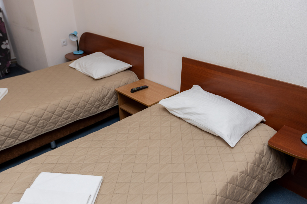 Двухместный номер с двумя односпальными кроватями. Санузел(туалет и душ)- за пределами номера. Номера на 5 этаже, без лифта.